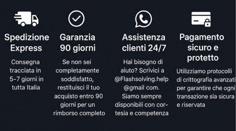 Il Team FlashSolving offre supporto rapido per ordini, resi, garanzia e consigli d'uso dei prodotti. Risposte tempestive e chiare migliorano l'esperienza d'acquisto e la fidelizzazione.